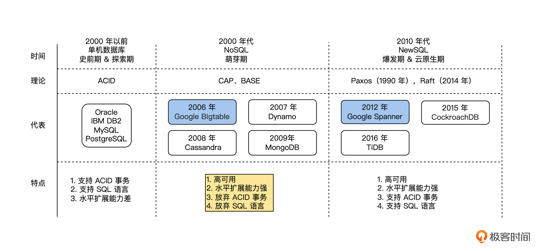 接着,是 2000 年代的萌芽期,人们接受了 BASE 理论和 CAP 理论,为了应对互联网的海量数据,人们为了水平扩展能力而放弃了 ACID 事务,这一时期出现了大量的 NoSQL 数据库。