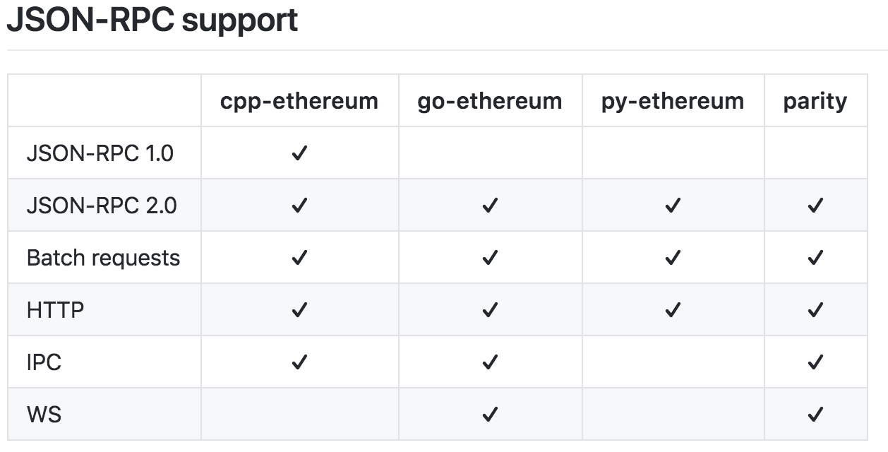 以太坊社区提供了多种语言实现的客户端和开发库,多数客户端支持JSON-RPC2.0标准,目前支持的客户版本有Go-ethereum(Go语言)、Parity(Rust语言)、Cpp-ethereum(C++语言)、Ethereum-lib(Javascript)、EthererumJ(Java语言)、Pyethapp(Python语言),基本涵盖了主流编程语言。