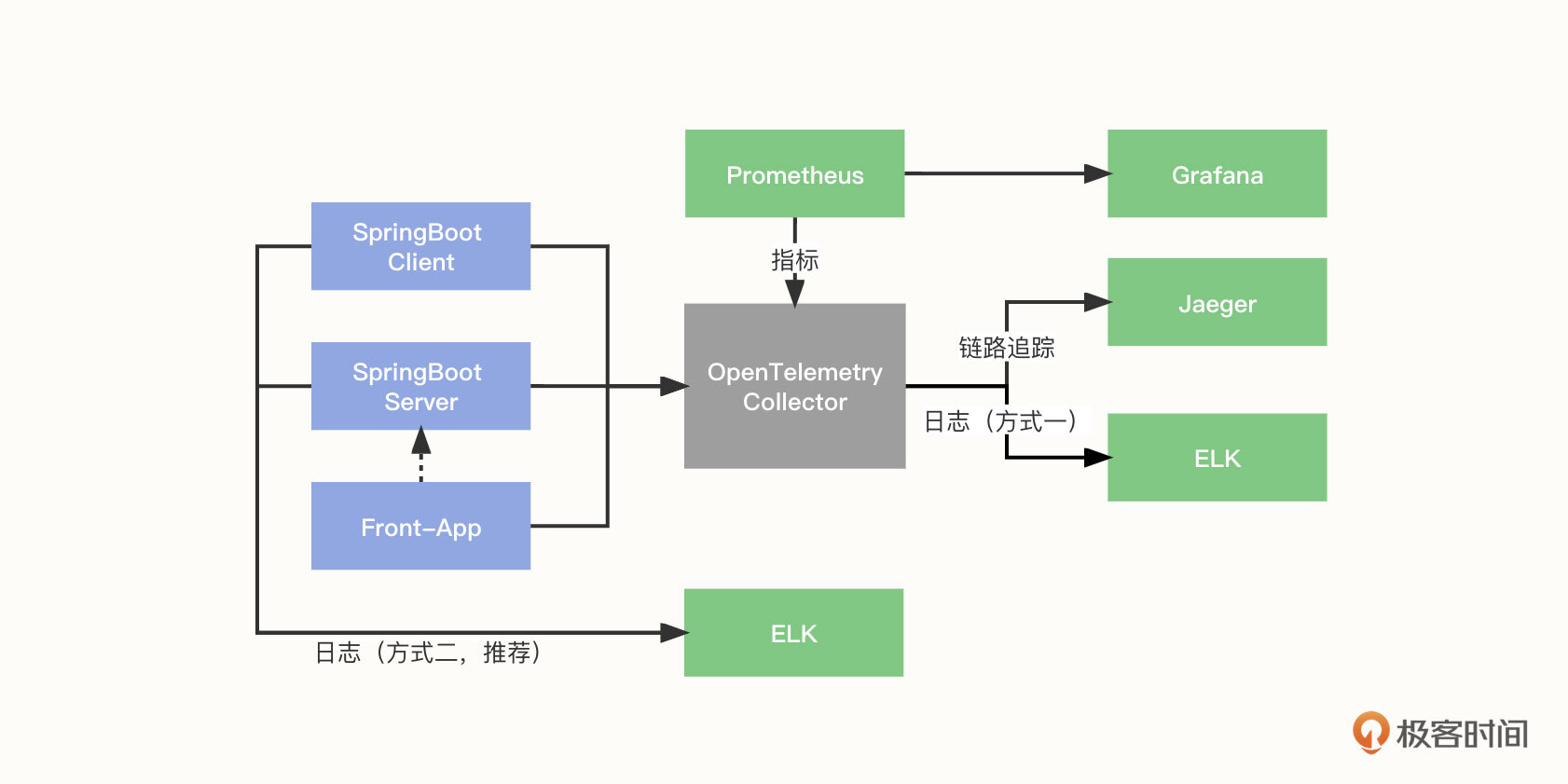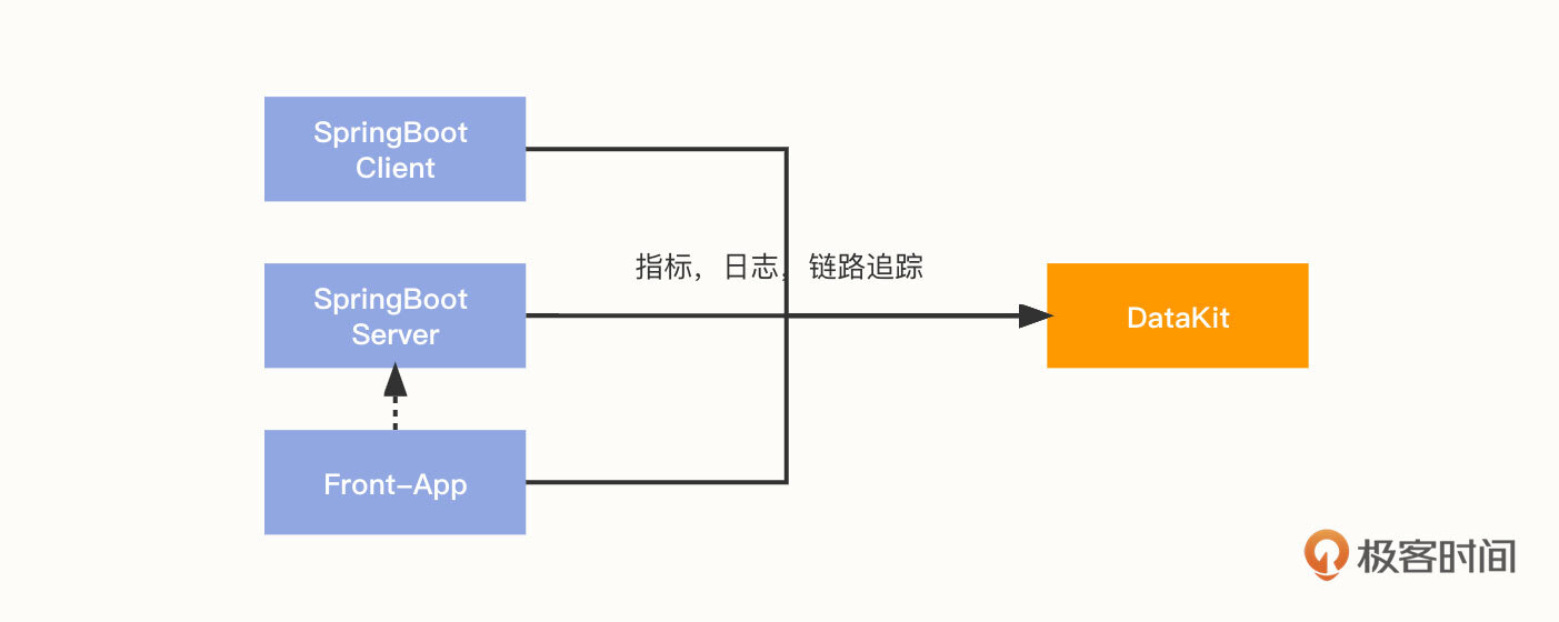 我们以一个 SpringBoot 应用为例,解读一下数据采集和传输的过程: