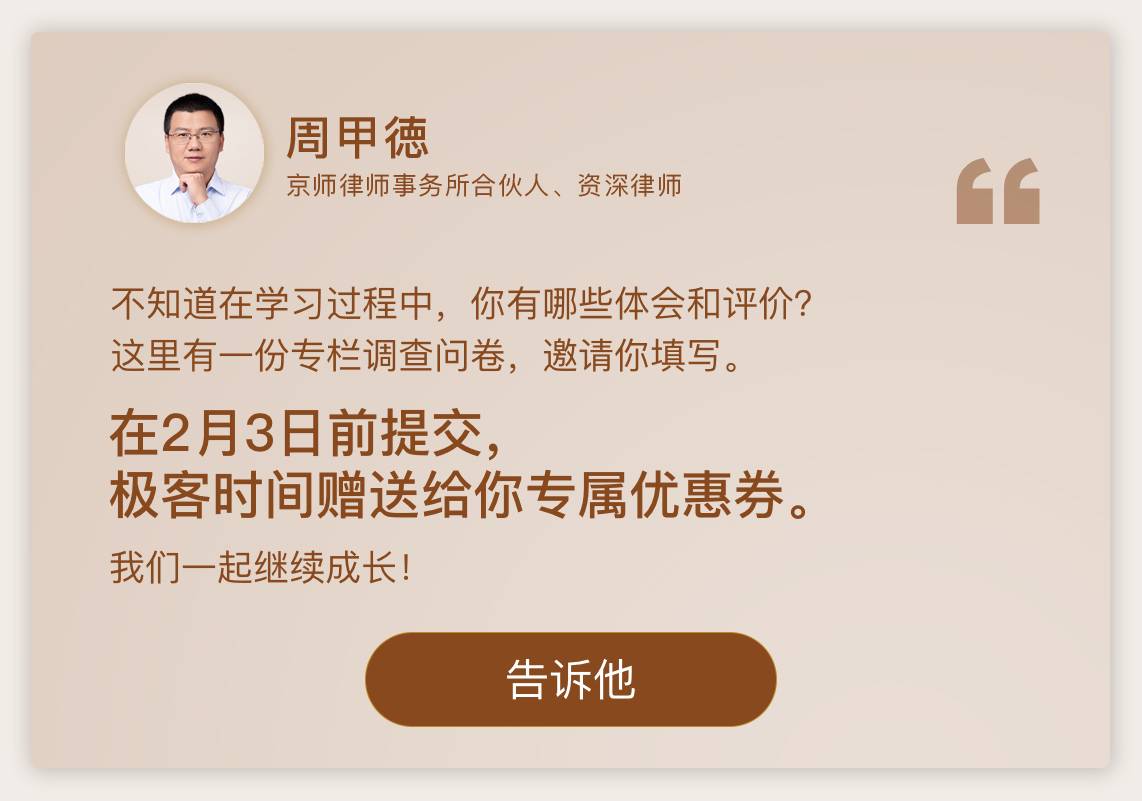 只要专栏在,我就一直在你身边,尽力帮你答疑解惑。随着新的法律法规、司法解释、部门规章、会议纪要等出台,专栏的部分法律知识就需要修改。对于这些新情况、新问题,我也会再继续修改、完善下去。