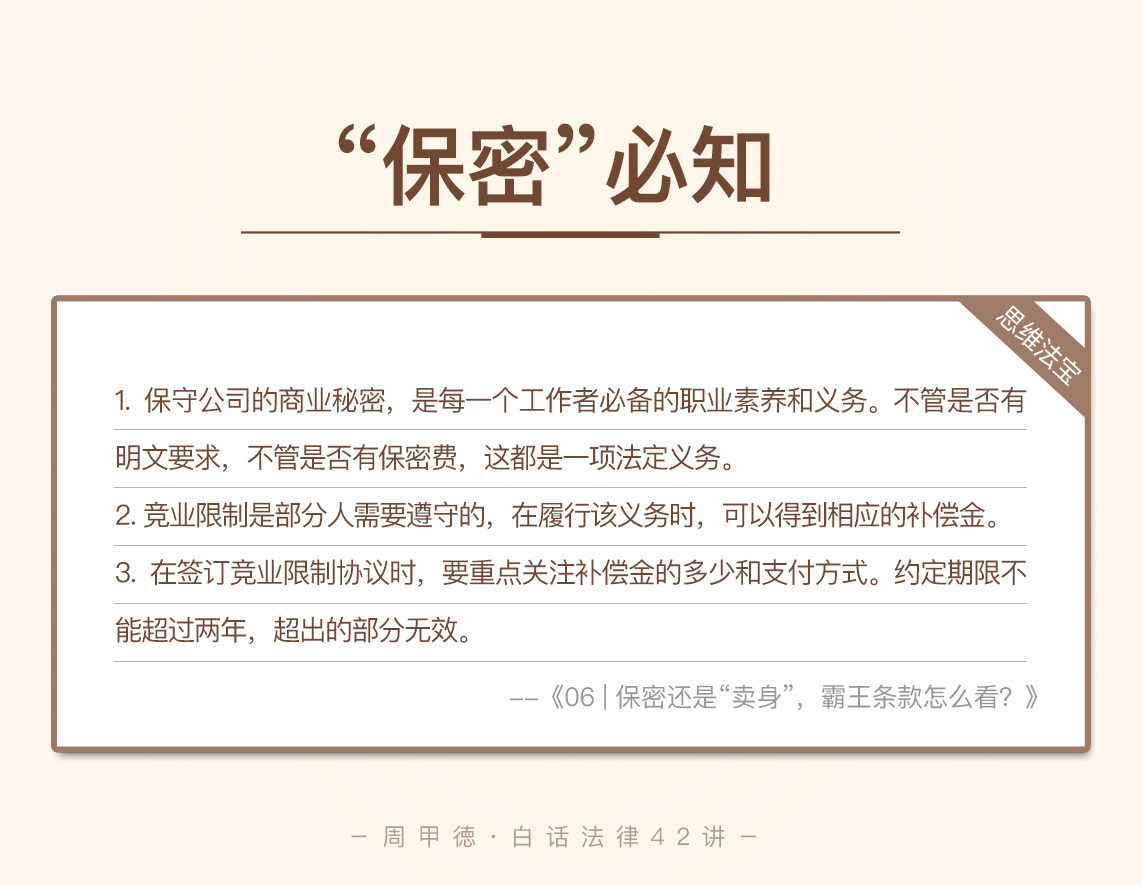 今天的知识主要就是这些了。讲到这里,相信对于商业秘密、保密协议和竞业限制的内容,你都不再陌生,也不会轻易栽跟头,我的目的也就达到了。