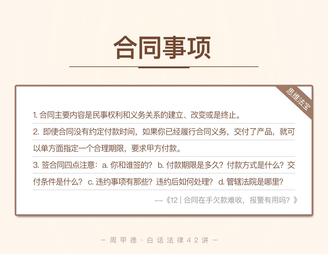 从这里也能看出来,前面我们学过的很多知识,都是建立在合同这个白纸黑字的法律证据上的。合同意识,