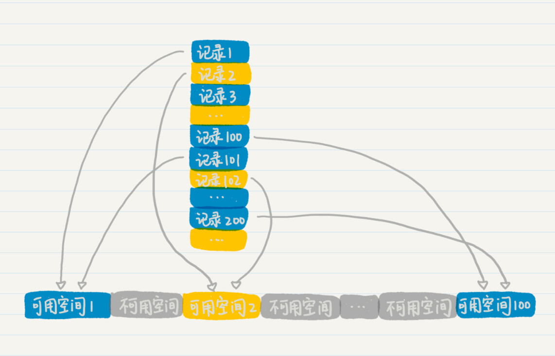 假设有两条记录,它们的记录标号分别是1和101。我们把这些模100之后余数都是1的,存放到第1个可用空间里。以此类推,将余数为2的2、102、202等,存放到第2个可用空间,将100、200、300等存放到第100个可用空间里。