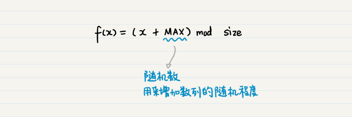 除此之外,为了增加数据散列的随机程度,我们还可以在公式中加入一个较大的随机数MAX,于是,上面的公式就可以写成这样: