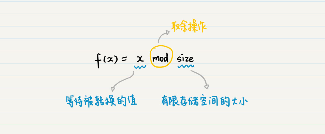 在这个公式中,x表示等待被转换的数值,而size表示有限存储空间的大小,mod表示取余操作。通过余数,你就能将任何数值,转换为有限范围内的一个数值,然后根据这个新的数值,来确定将数据存放在何处。