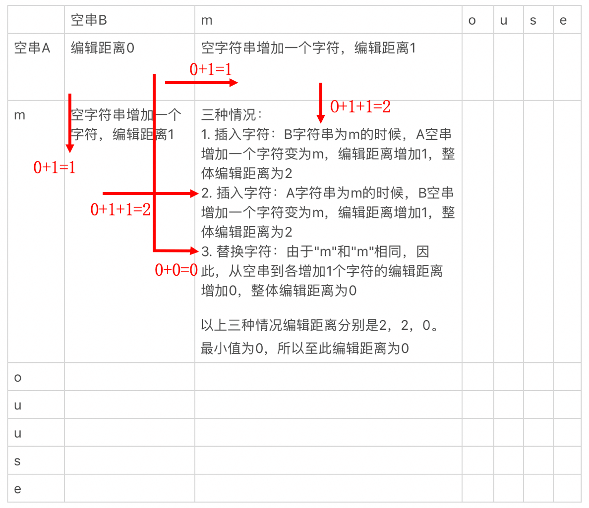 这张表格里的不同状态之间的转移,就是状态转移。其中红色部分表示字符串演变(或者说状态转移)的方式以及相应的编辑距离计算。对于表格中其他空白的部分,我暂时不给出,你可以试着自己来推导。