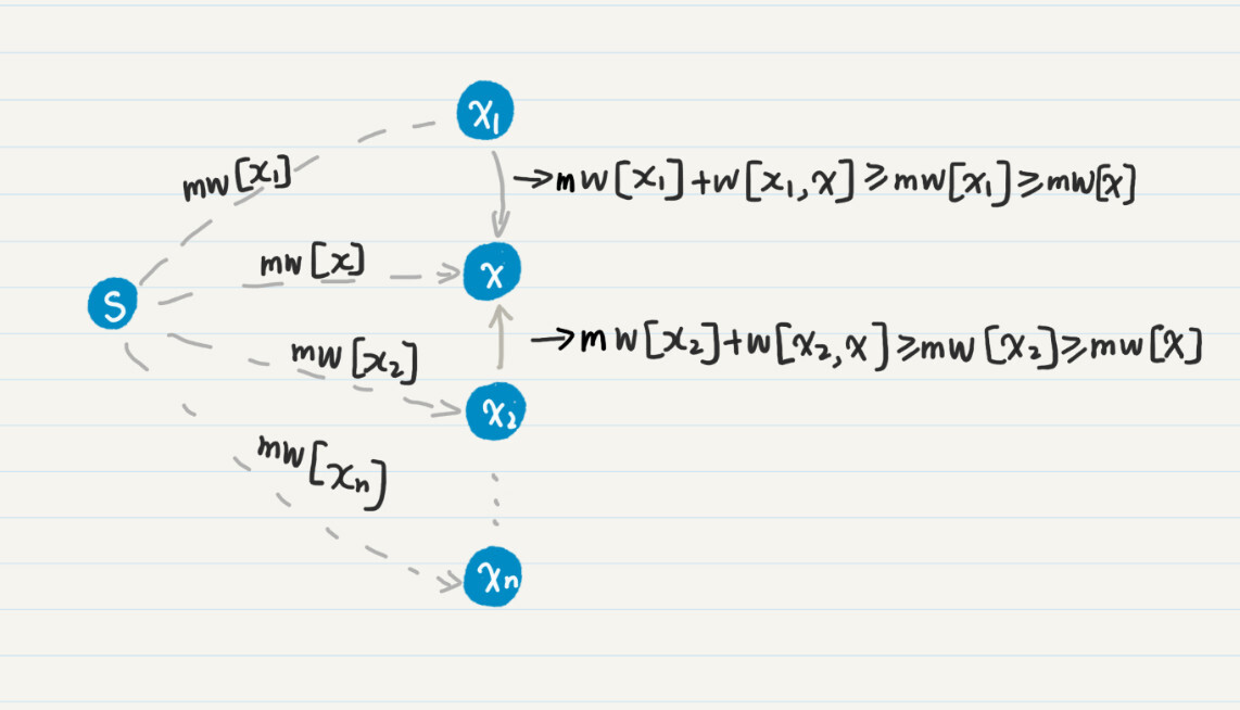 图中的虚线表示省去了通路中间的若干结点。mw[x]是当前mw数组中的最小值,所以它小于等于任何一个mw[xn],其中xn不等于x。