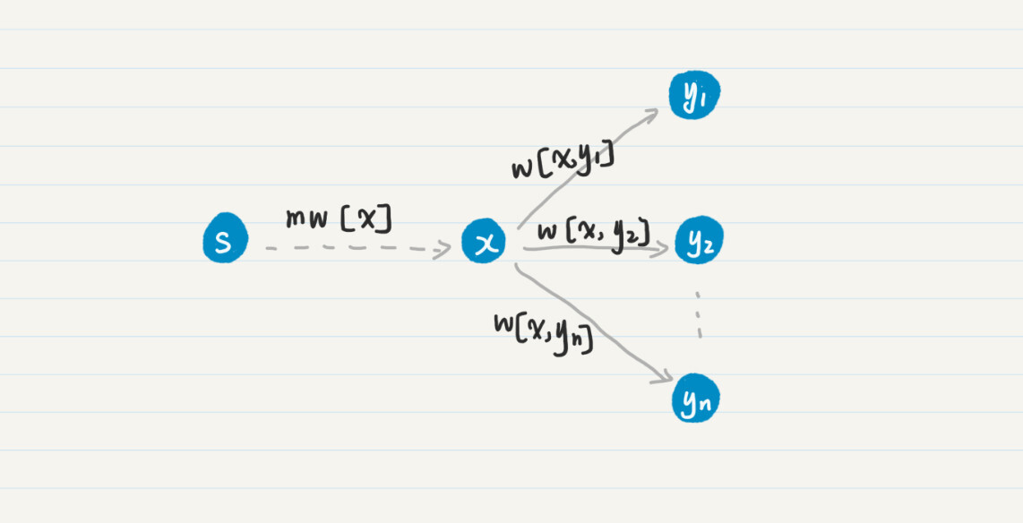 在这个图中,x直接相连\(y\_{1}\),\(y\_{2}\),…,\(y\_{n}\)。从点s到点x的mw[x]已经确定了,那么对于从s到yn的所有通路,只有两种可能,经过x和不经过x。如果这条通路经过x,那么其权重的最小值就是mw’[\(y\_{i}\)] = mw[x] + w[x, \(y\_{i}\)]中的一个(1≤i≤n),我们只需要把这个值和其他未经过x结点的通路之权重对比就足够了。这就是为什么每次要更新和x直接相连的结点之mw。