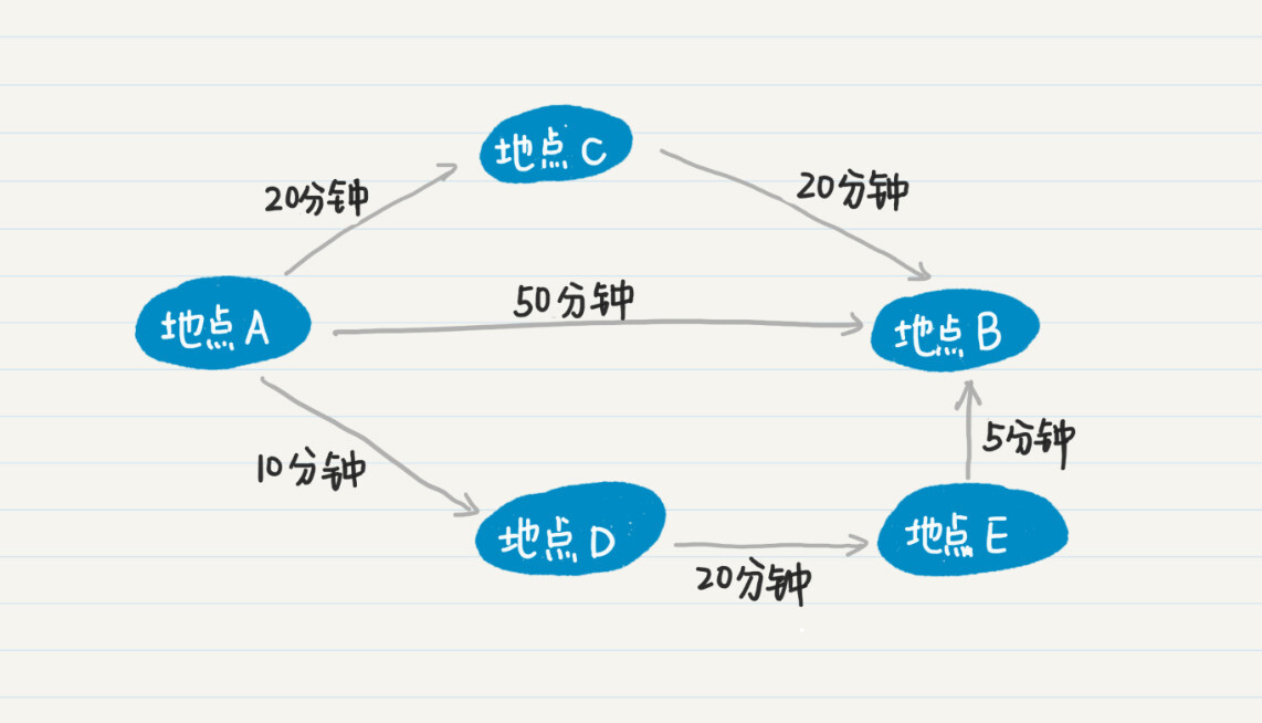 我们需要先把交通地图转为图的模型。图中的每个结点表示一个地点,每条边表示一条道路或者交通工具的路线。其中,边是有向的,表示单行道等情况;其次,边是有权重的。