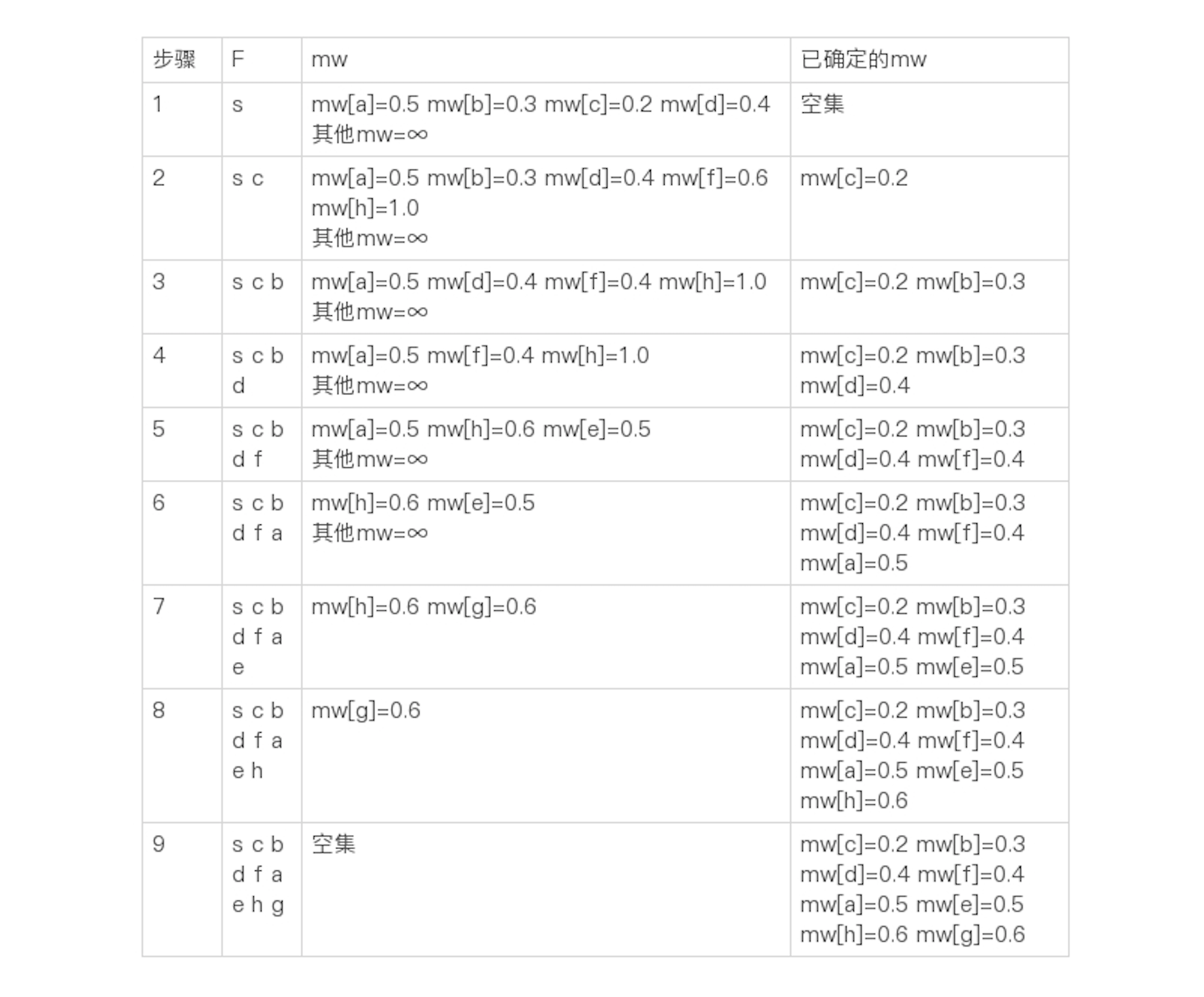 然后,我们从mw选出最小的值0.3,把对应的结点b加入集合F,并更新和b直接相连的结点a和f的mw值。以此逐步类推,可以得到如下的最终结果: