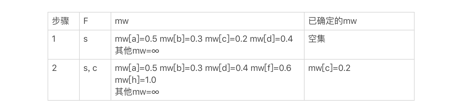 然后,我们从mw选出最小的值0.2,把对应的结点c加入集合F,并更新和c直接相连的结点f、h的mw值,得到如下结果: