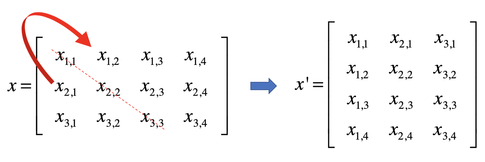 转置(Transposition)是指矩阵内的元素行索引和纵索引互换,例如\(X\_{ij}\)就变为\(X\_{ji}\),相应的,矩阵的形状由转置前的n × m变为转置后的m × n。从几何的角度来说,矩阵的转置就是原矩阵以对角线为轴进行翻转后的结果。下面这张图展示了矩阵\(X\)转置之后的矩阵\(X’\):