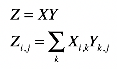 其中,矩阵\(Z\)为矩阵\(X\)和\(Y\)的乘积,\(X\)是形状为i x k的矩阵,而\(Y\)是形状为k × j的矩阵。\(X\)的列数k必须和\(Y\)的行数k相等,两者才可以进行这样的乘法。