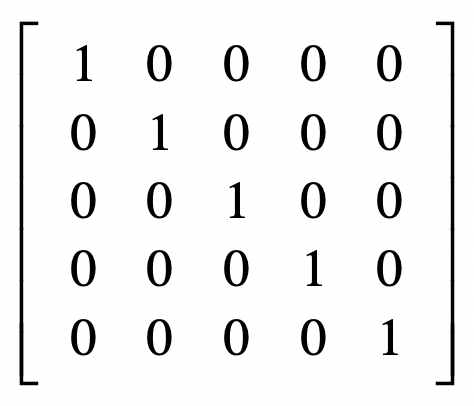 除了转置矩阵,另一个重要的概念是逆矩阵。为了理解逆矩阵或矩阵逆(Matrix Inversion),我们首先要理解单位矩阵(Identity Matrix)。单位矩阵中,所有沿主对角线的元素都是1,而其他位置的所有元素都是0。通常我们只考虑单位矩阵为方阵的情况,也就是行数和列数相等,我们把它记作\(I\_{n}\),\(n\)表示维数。我这里给出一个\(I\_{5}\)的示例。