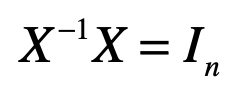 如果有矩阵\(X\),我们把它的逆矩阵记做\(X^{-1}\),两者相乘的结果是单位矩阵,写成公式就是这种形式: