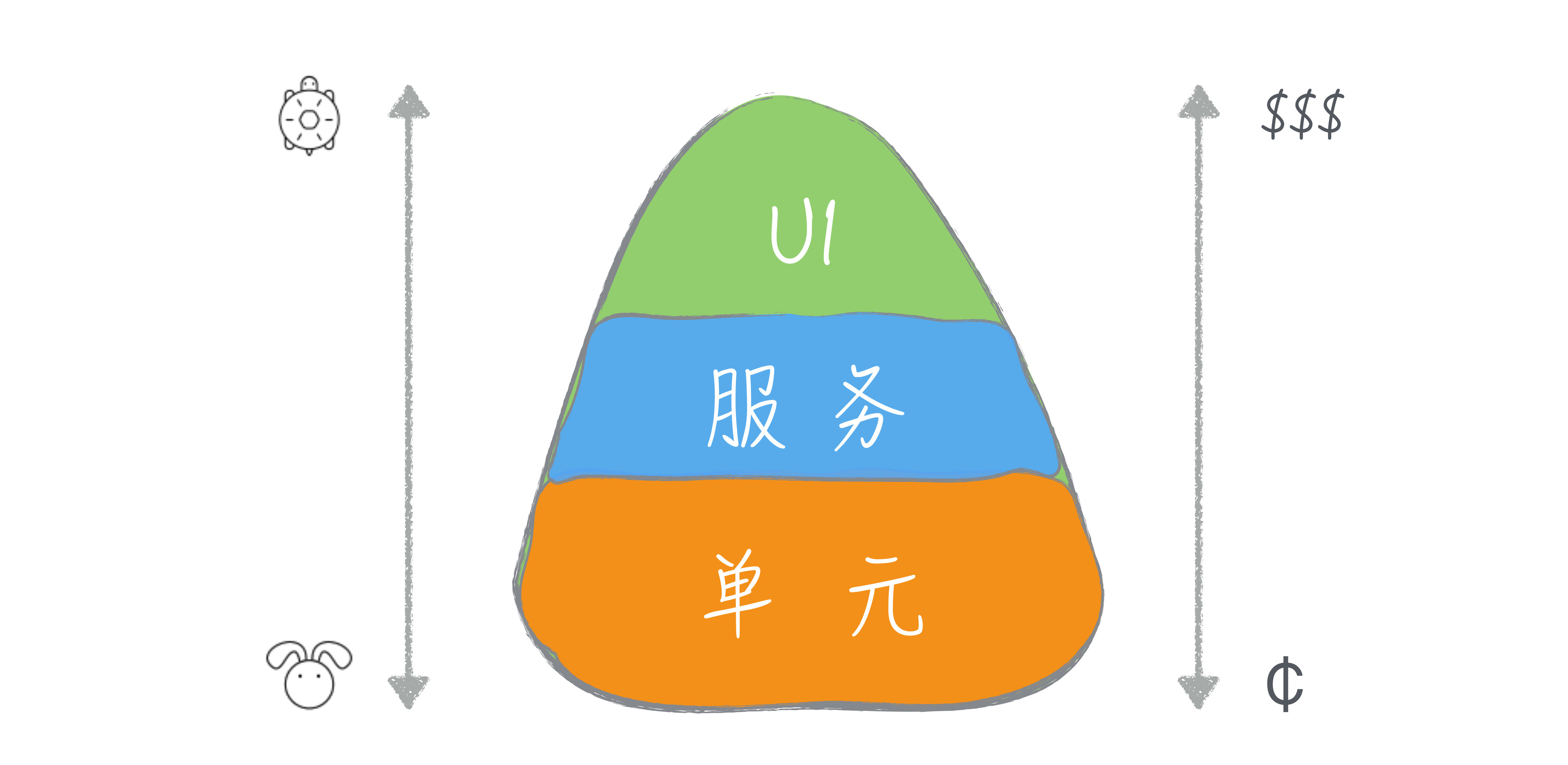 在这个图里,单元测试在最下面,表示它是底层的;然后层次逐渐升高,系统测试,也就是图上的端到端测试就是高层测试,在最上面。所有自动化测试形成了蛋卷部分,而外面的冰淇淋部分则是手工的测试。