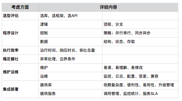 而对于实现,你应该已经很清楚是在做什么了。但我在这里不妨更清晰地分解一下。实现的最终交付物是程序代码,但这个过程中会发生什么?一般会有下面6个方面的考虑:选型评估;程序设计;执行效率;稳定健壮;维护运维;集成部署。
