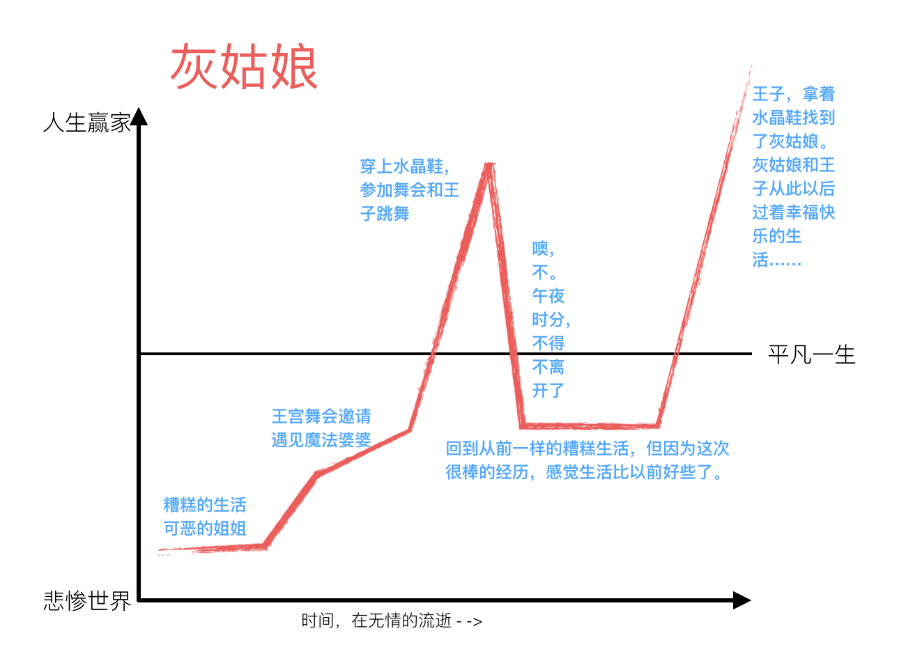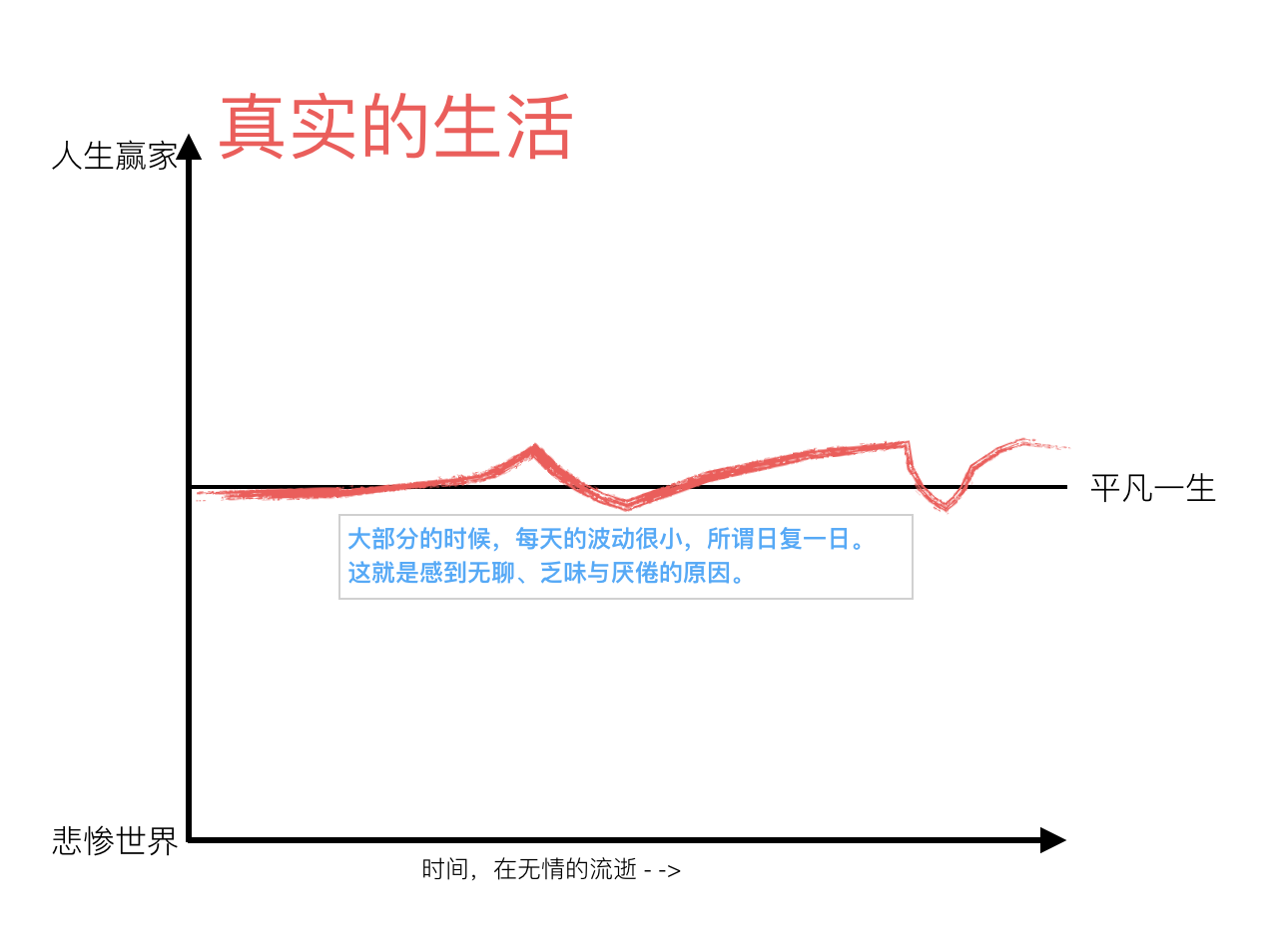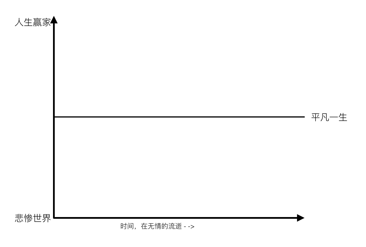 其中,纵坐标表示生活的幸福程度。越往上,代表幸福指数越高;越往下,代表幸福指数越低。中间的横线表示普通大众的平凡人生。