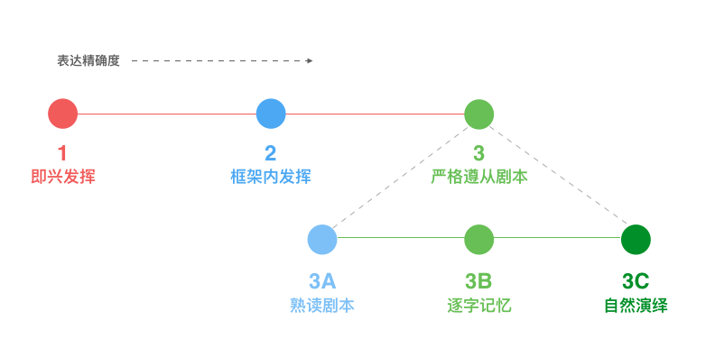 演,即表演和发挥;表演的准备,有三个层级,如下图(原图来自 Tim Urban’s Memorization Spectrum,翻译后重绘制):即兴发挥、框架内发挥和严格遵从剧本。