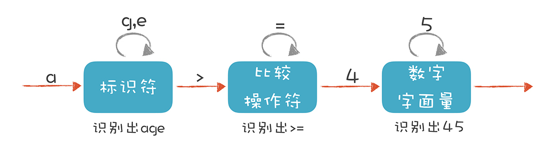 词法分析器也是一样,它分析整个程序的字符串,当遇到不同的字符时,会驱使它迁移到不同的状态。例如,词法分析程序在扫描age的时候,处于“标识符”状态,等它遇到一个>符号,就切换到“比较操作符”的状态。词法分析过程,就是这样一个个状态迁移的过程。