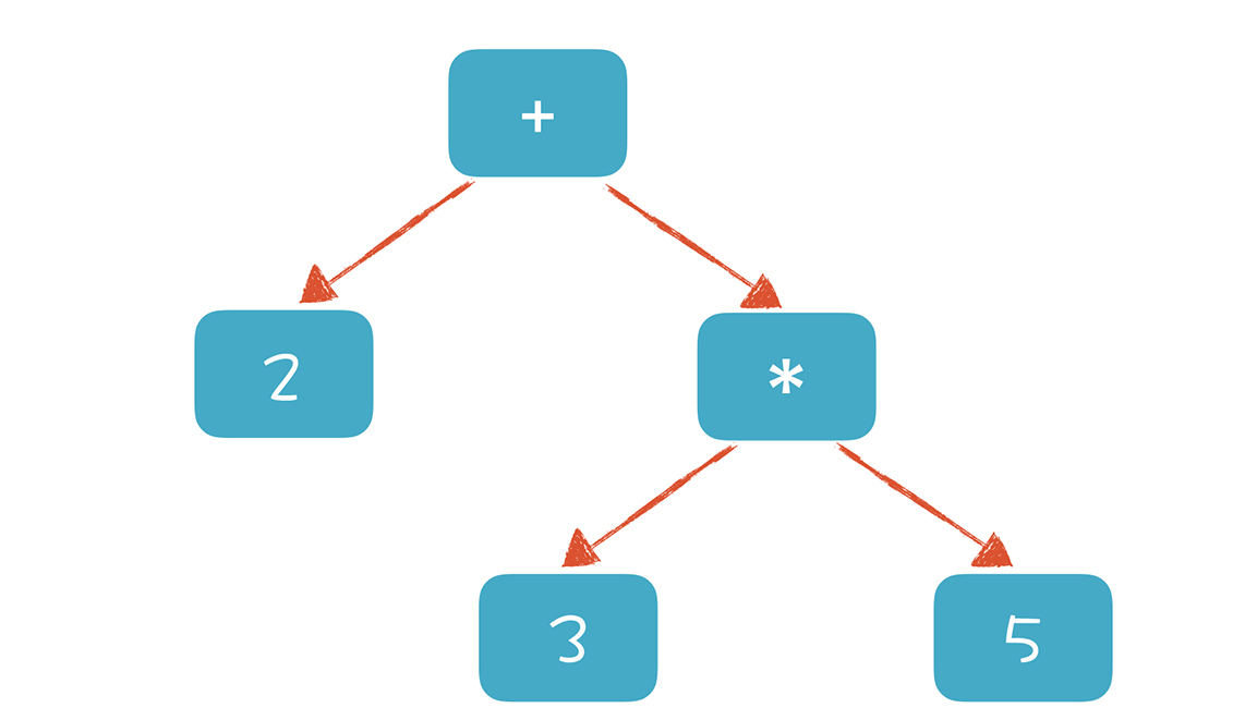 如果要计算表达式的值,只需要对根节点求值就可以了。为了完成对根节点的求值,需要对下级节点递归求值,所以我们先完成“3 * 5 = 15”,然后再计算“2 + 15 = 17”。