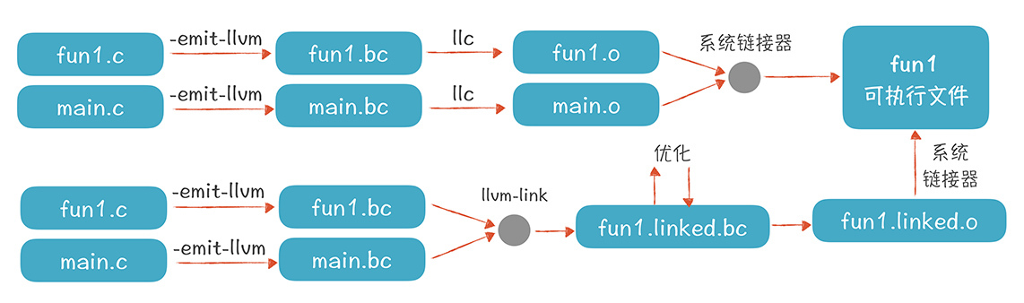 实际上,使用LLVM从源代码到生成可执行文件有两条可能的路径: