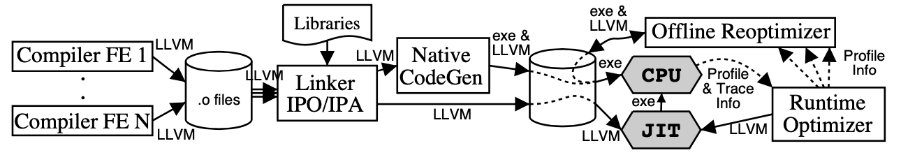 以运行时优化为例,基于LLVM我们能够在运行时,收集一些性能相关的数据对代码编译优化,可以是实时优化的、动态修改内存中的机器码;也可以收集这些性能数据,然后做离线的优化,重新生成可执行文件,然后再加载执行,这一点非常吸引我,因为在现代计算环境下,每种功能的计算特点都不相同,确实需要针对不同的场景做不同的优化。下图展现了这个过程(图片来源《 LLVM: A Compilation Framework for Lifelong Program Analysis & Transformation》):