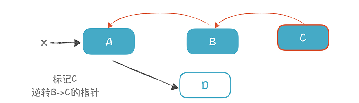 关于这个技术,你需要注意其中一个技术细节:内存对象中,可能没有空间来存一个指针信息。比如下图中,B对象原来就有一个变量,用来保存指向C的指针。现在用这个变量的位置保存逆转指针,来指向A就行了。但到C的时候,发现C没有空间来存逆转到B的指针。