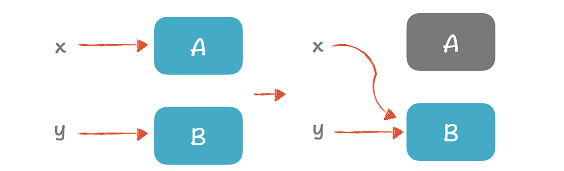但是,如果给变量赋予一个新的地址,或者当栈桢弹出,该栈桢的变量全部失效,这时,变量所指向的内存就无用了(如图中的灰色块)。