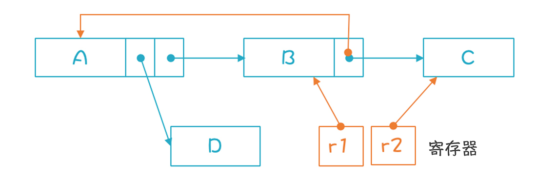 在堆中申请一块内存时(比如Java中的对象实例),我们会用一个变量指向这块内存。这个变量可能是:全局变量、常量、栈里的变量、寄存器里的变量。我们把这些变量叫做GC根节点。它指向的对象中,可能还包含指向其他对象的指针。