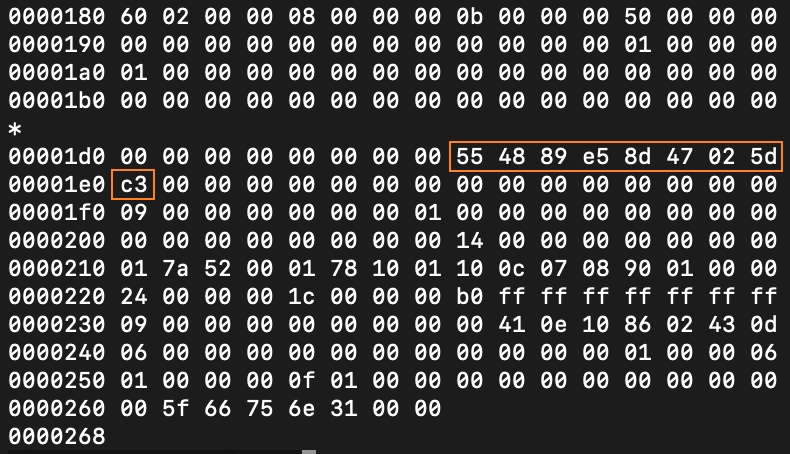 另外,用“hexdump foo.o”命令显示这个二进制文件的内容,也能找到这9个字节(图中橙色框中的内容)。