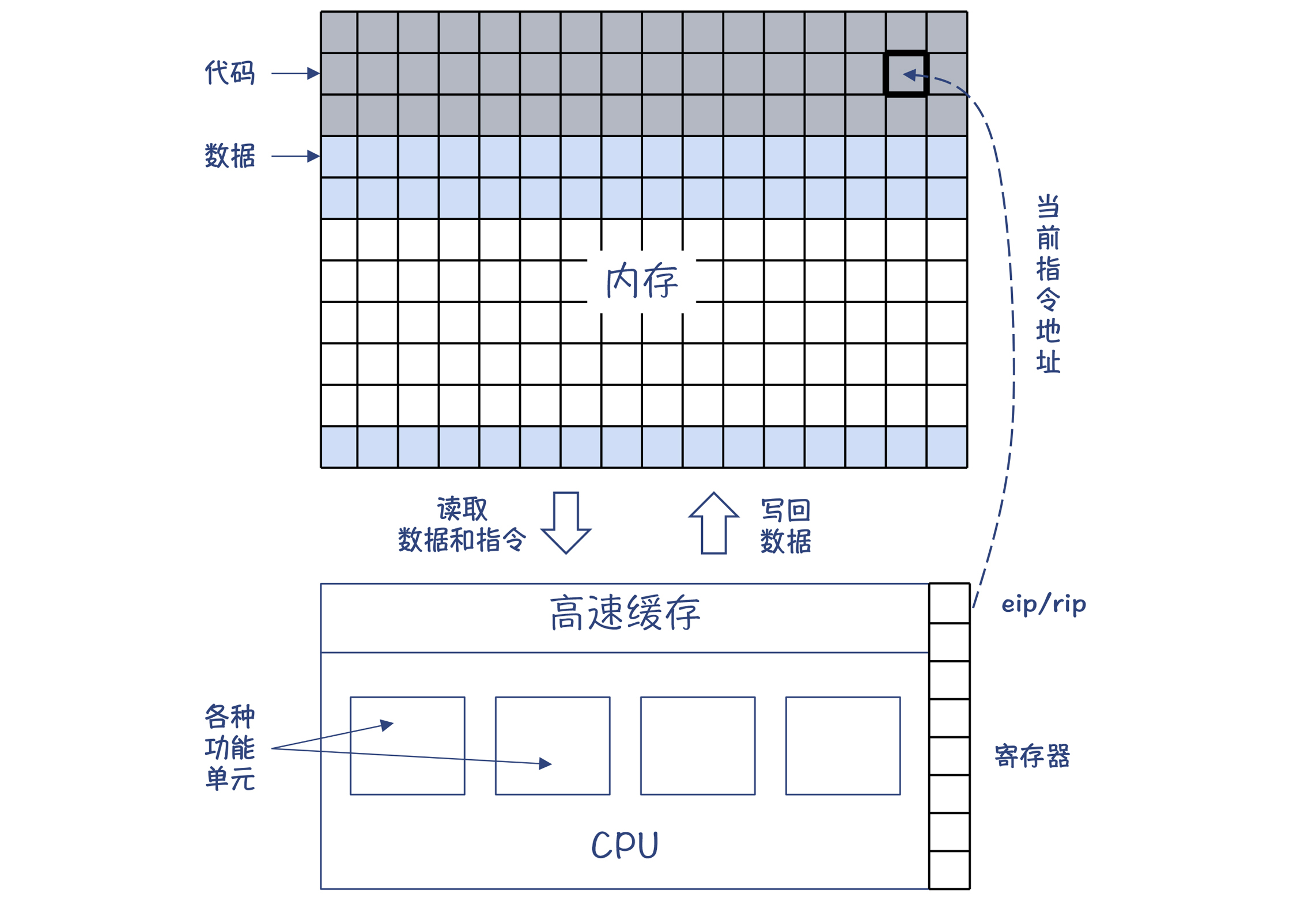 在计算机发展的早期,科学家们确立了计算机的结构,并一直延续至今,这种结构就是冯·诺依曼结构。它的主要特点是:数据和指令不加区别,混合存储在同一个存储器中(即主存,或叫做内存);用一个指令指针指向内存中指令的位置,CPU就能自动加载这个位置的指令并执行。