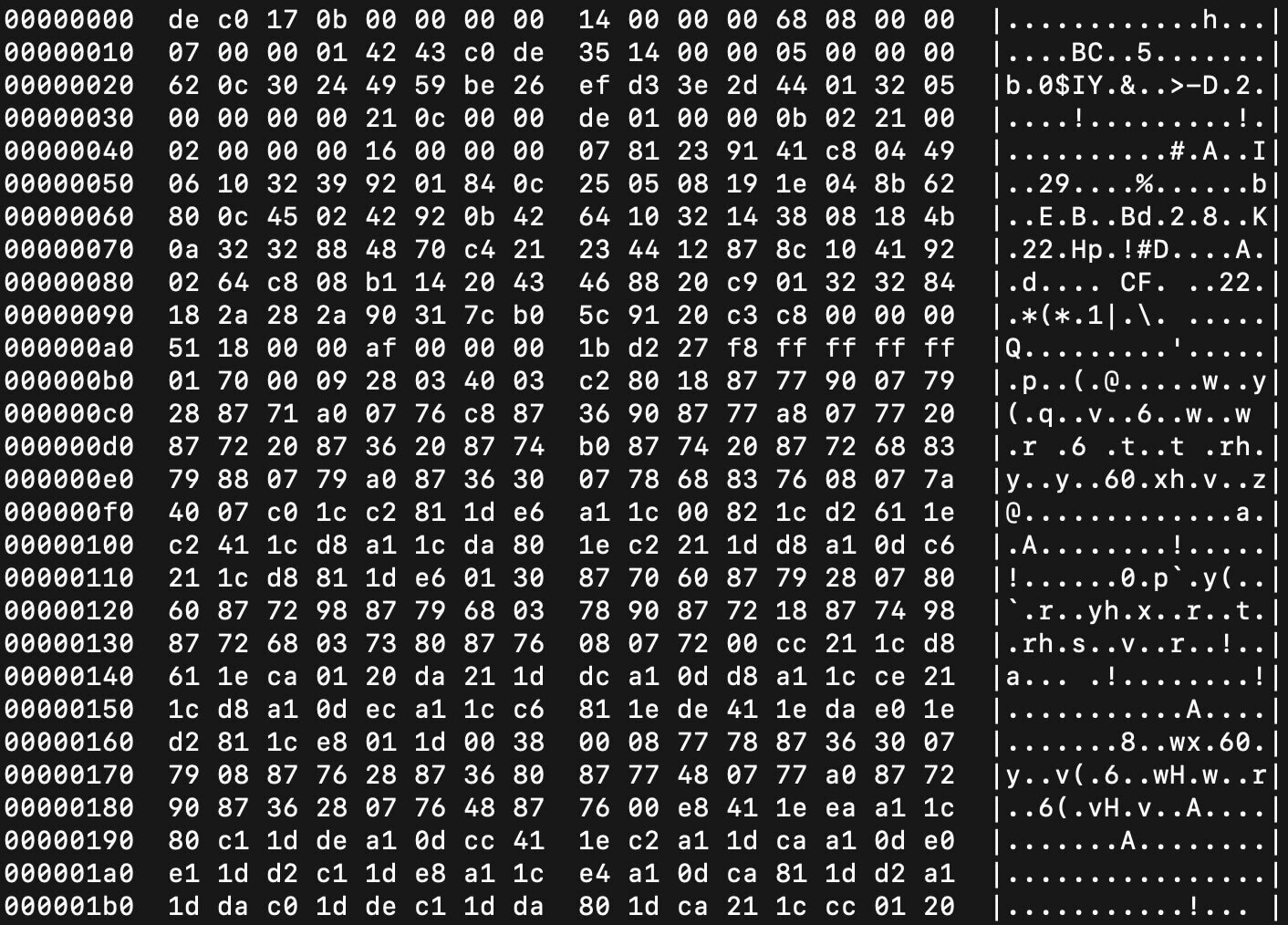 二进制格式(用“clang -emit-llvm -c fun1.c -o fun1.bc”命令生成,用“hexdump -C fun1.bc”命令显示):