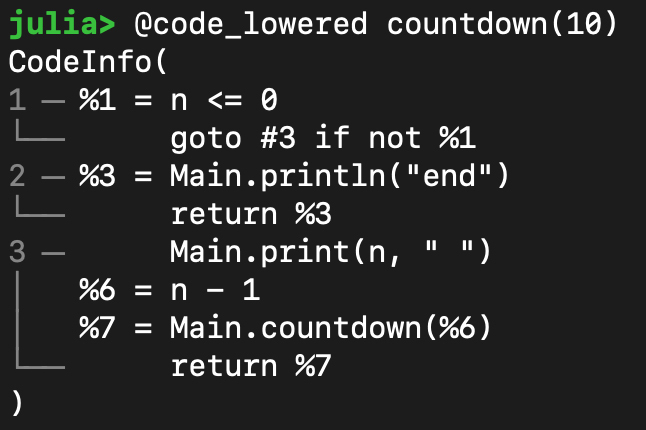 另一方面,为了调试的需要,你可以把IR以文本的方式输出,用于显示和分析。在这门课里,你也会看到很多IR的输出格式。比如,下面是Julia的IR: