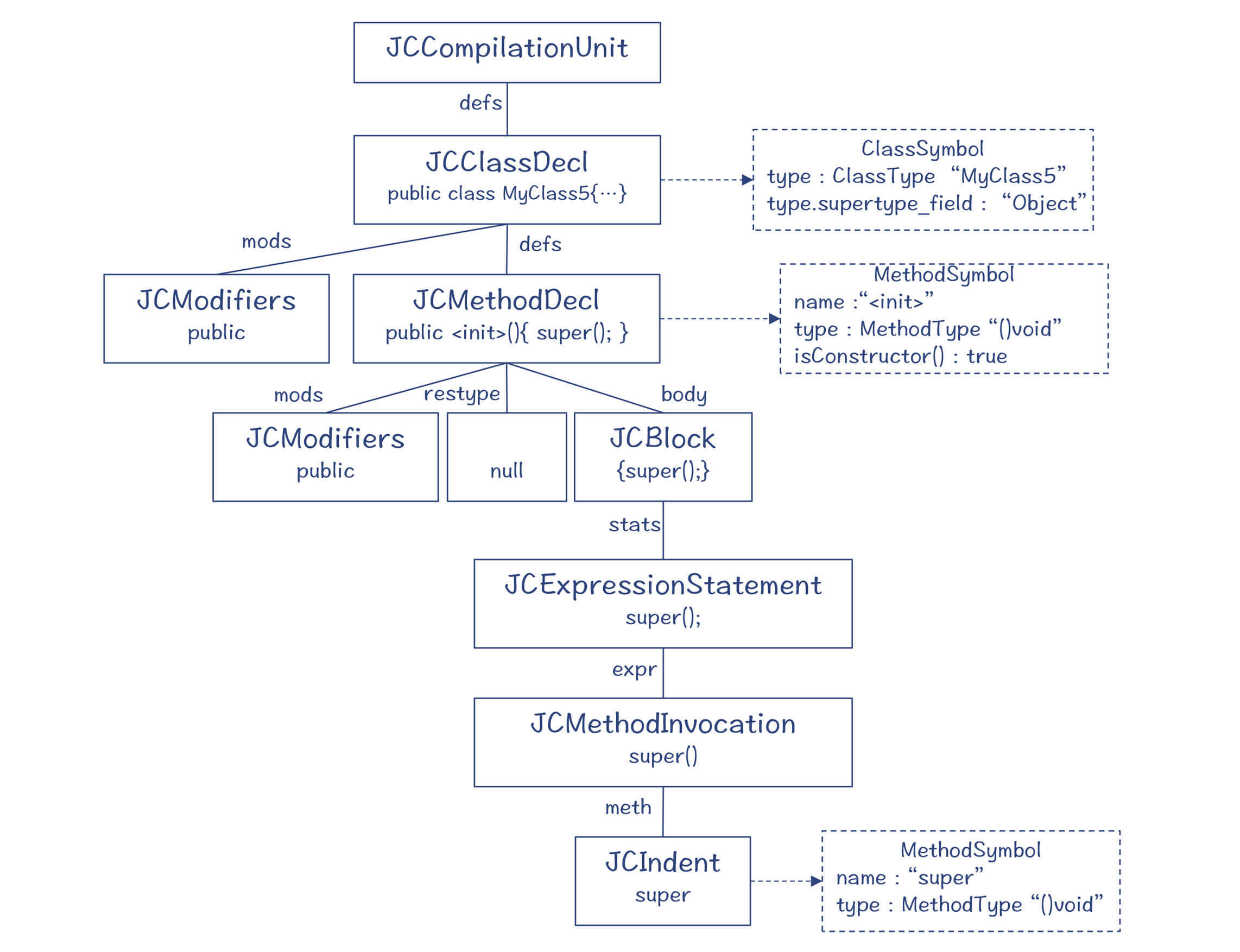 “super()”语句的叶子节点是一个JCIndent节点,也就是标识符。这个标识符的名称是”super“,而符号(sym属性),则通过变量引用消解,指向了Object类的构造方法。