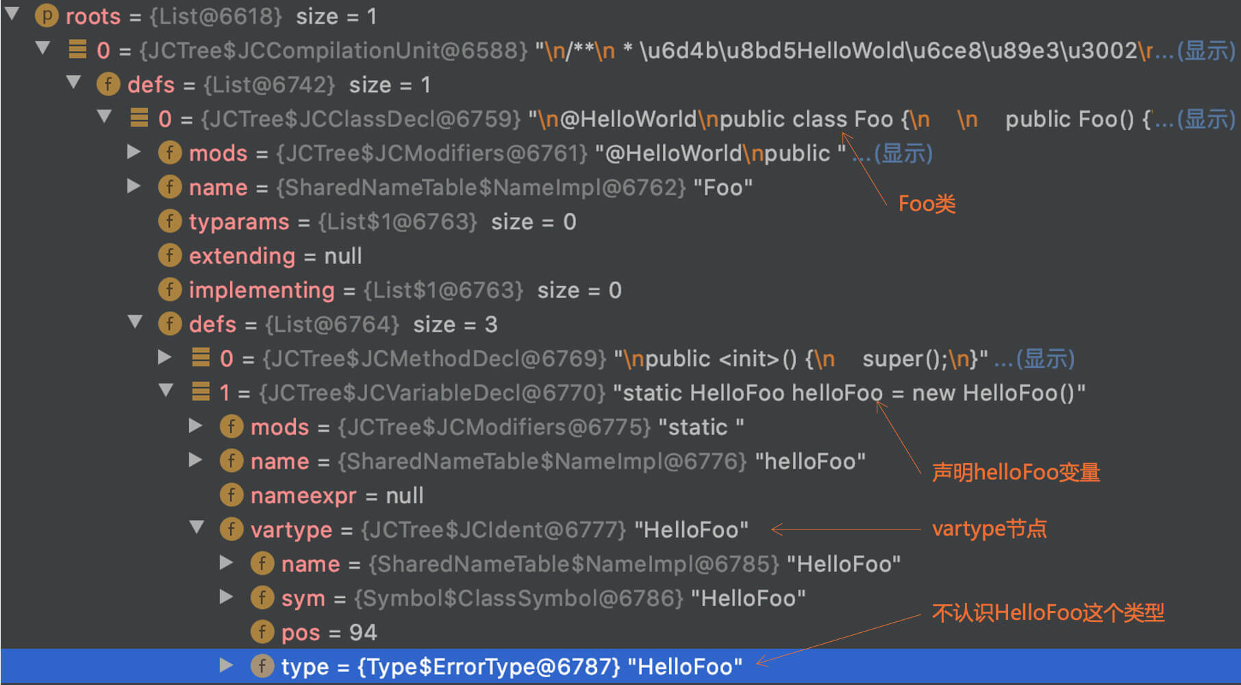 你会发现,在Enter之后,声明helloFoo这个成员变量的语句的vartype节点的类型是ErrorType,证明这个时候编译器是没有找到HelloFoo的定义的。