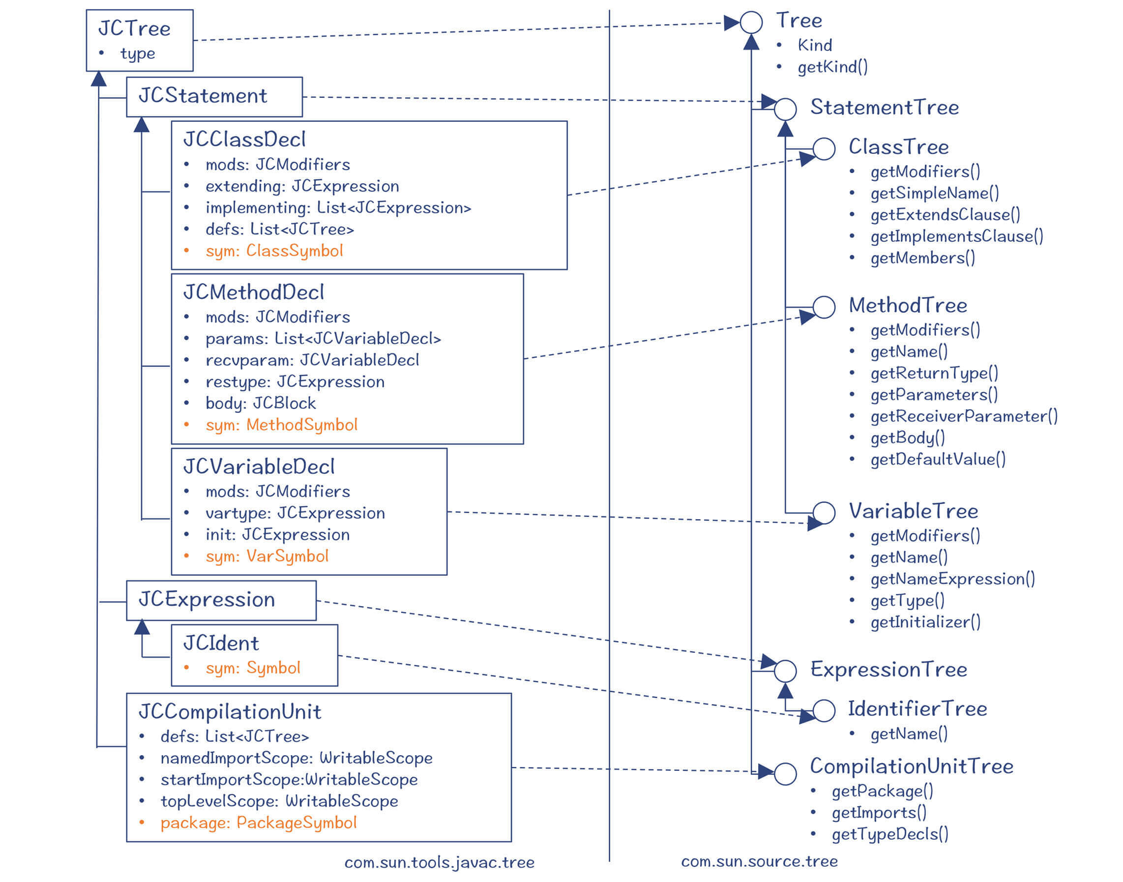 你可以看一下各个AST节点的定义,其中的类、方法、变量声明、编译单元,以及标识符,都带有一个sym成员变量,用来关联到一个符号。这样后续在遍历树的时候,你就很容易查到这个节点对应的Symbol了。