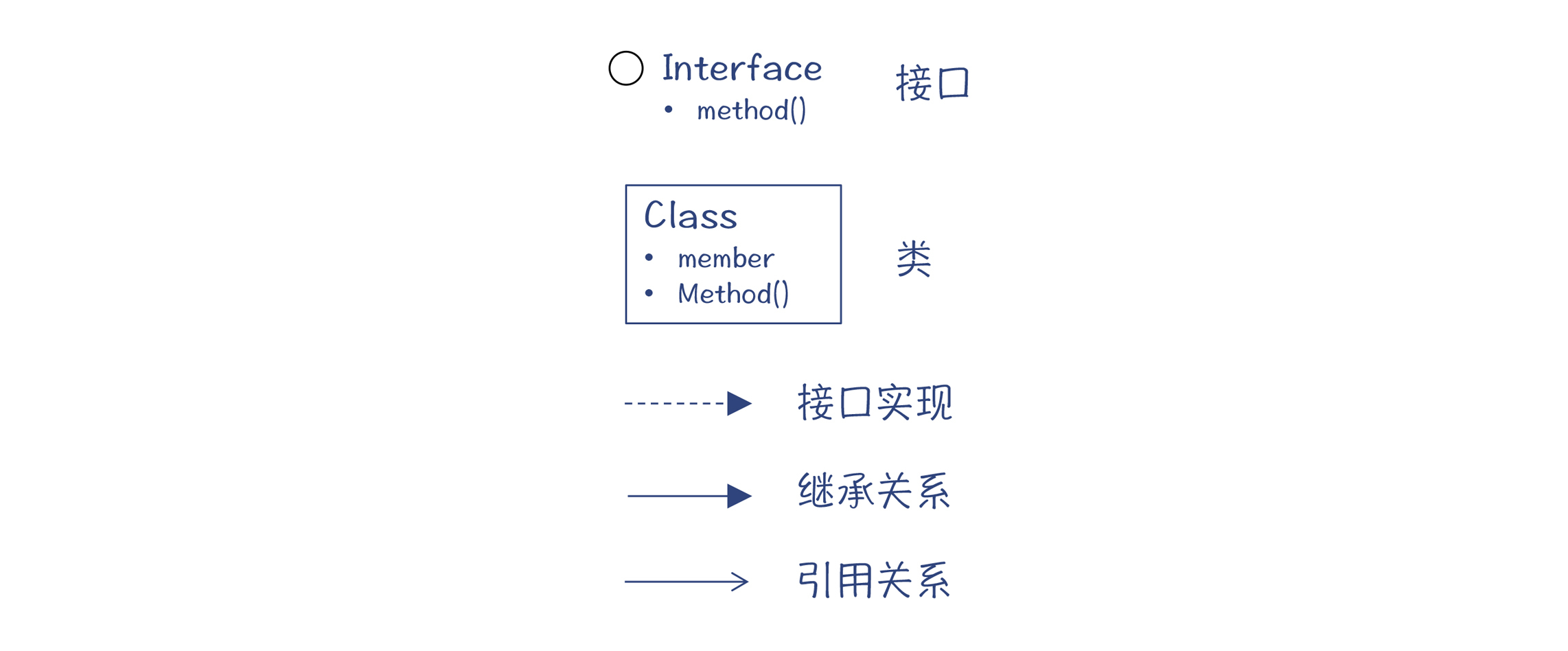 为了方便你理解Java编译器内部的一些对象结构,我画了一些类图(如果你不习惯看类图的话,可以参考下面的图表说明,比如我用方框表示一个类,用小圆圈表示一个接口,几种线条分别代表继承关系、引用关系和接口实现)。