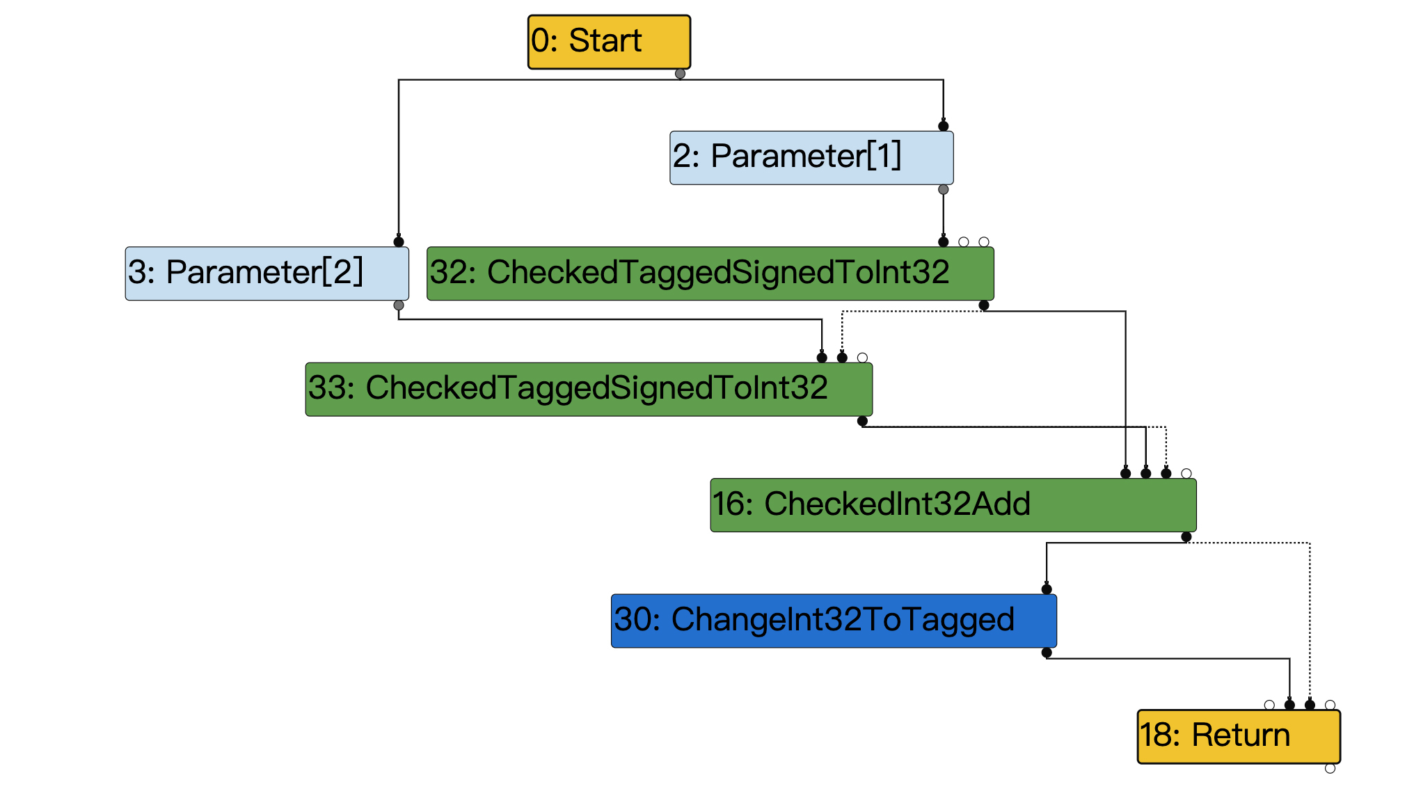 在v8.TFGenericLowering阶段,我们得到了如下所示的IR图,这个图只保留了计算过程的主干。里面增加了两个绿色节点,这两个节点就是把标记指针转换成整数的;还增加了一个深蓝色的节点,这个节点是在函数返回之前,把整数再转换成标记指针。