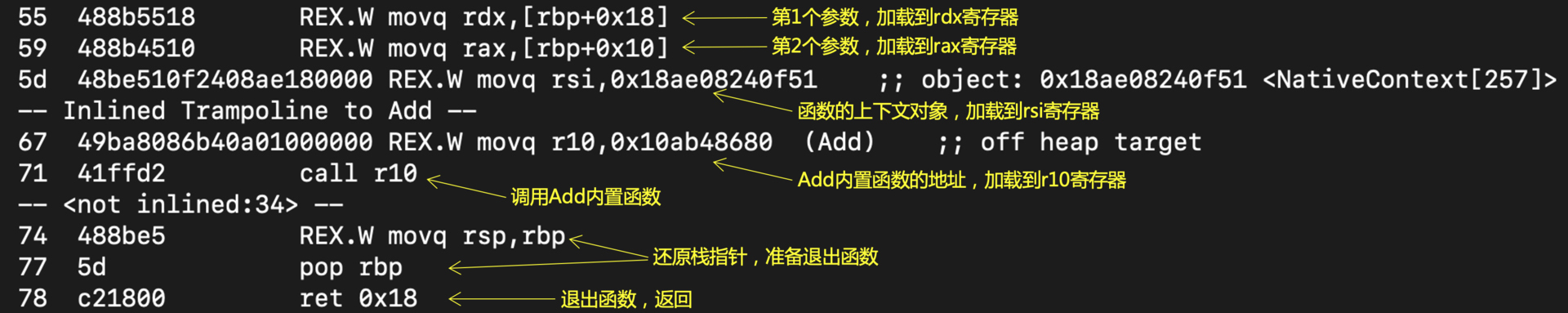 但是,如果不在解释器里执行,直接要求TurboFan做编译,会生成什么样的汇编代码呢?
