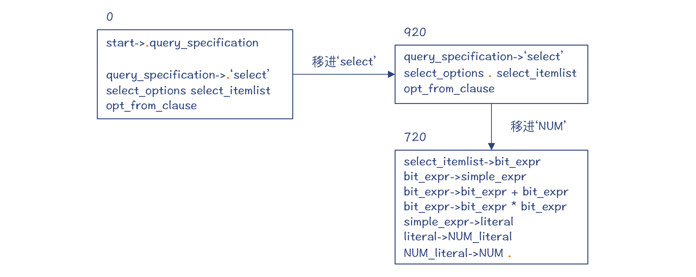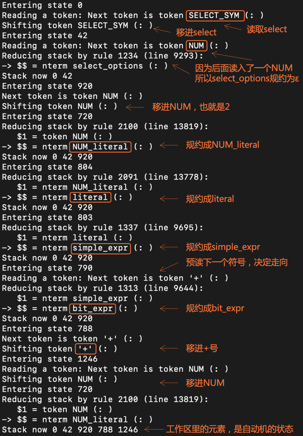 也就是,编译器依据“select_options->ε”做了一次规约,并进入了新的状态920。注意,状态42和920从DFA的角度来看,它们是同一个大状态。而DFA中包含了多个小状态,分别代表了不同的规约情况。