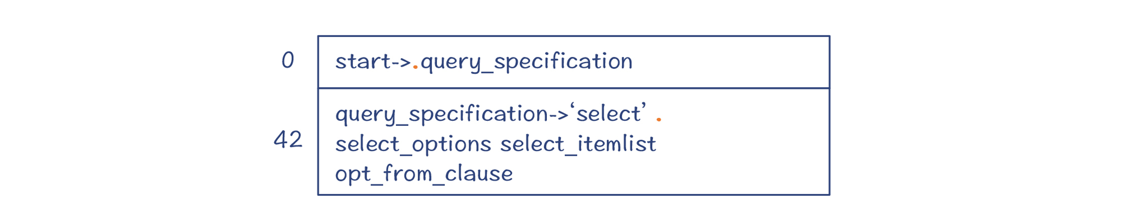 你可以看一下select_options、opt_from_clause和其他几个以opt开头的规则,它们都是SQL语句的组成部分。opt是可选的意思,也就是它的产生式可能产生ε。