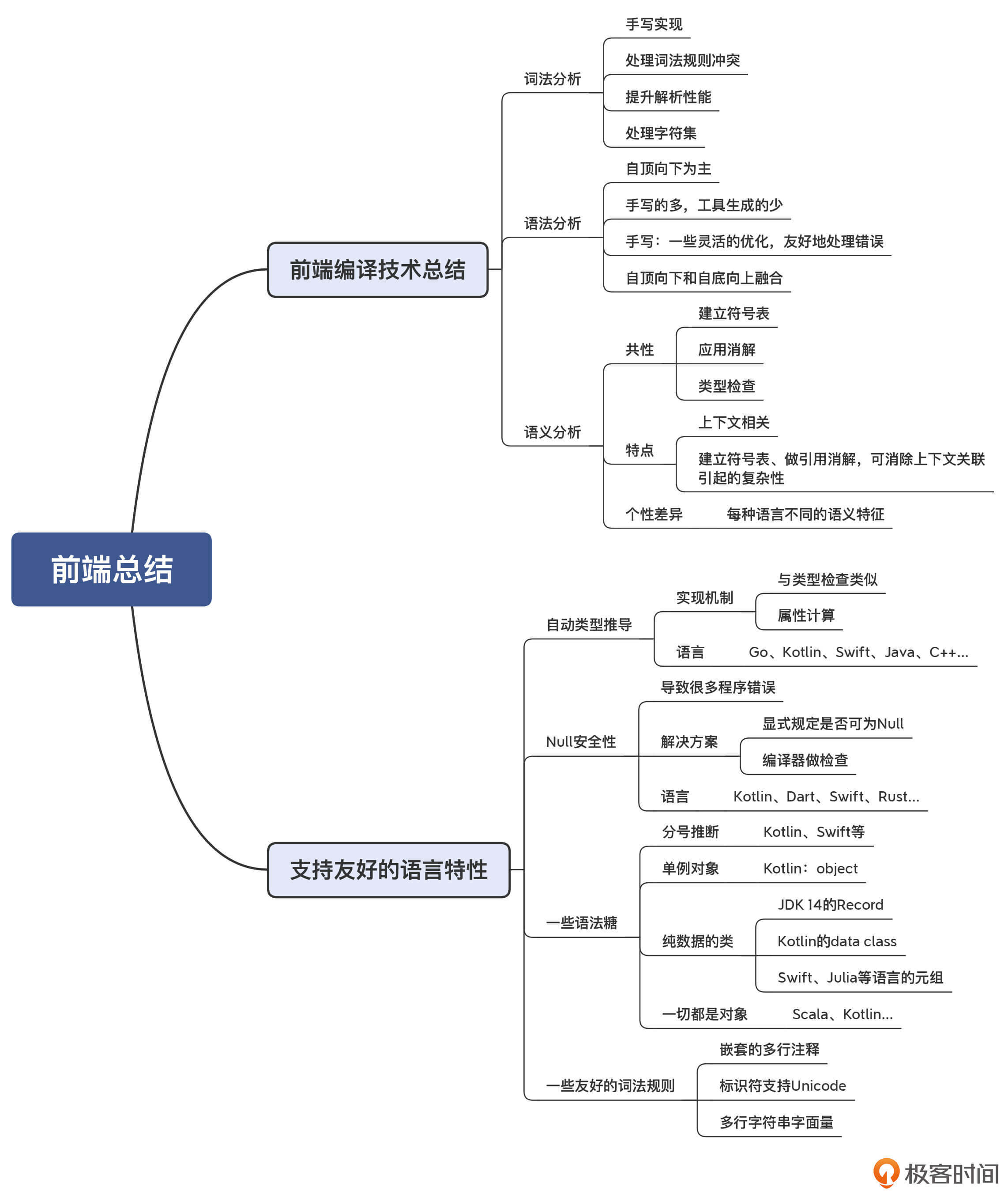 今天这一讲,我带你一起总结了一下编译原理的前端技术。在解析了这么多个编译器以后,你现在对于实现前端功能时,到底应该选择什么技术、不同的技术路线有什么优缺点,就都心里有数了。