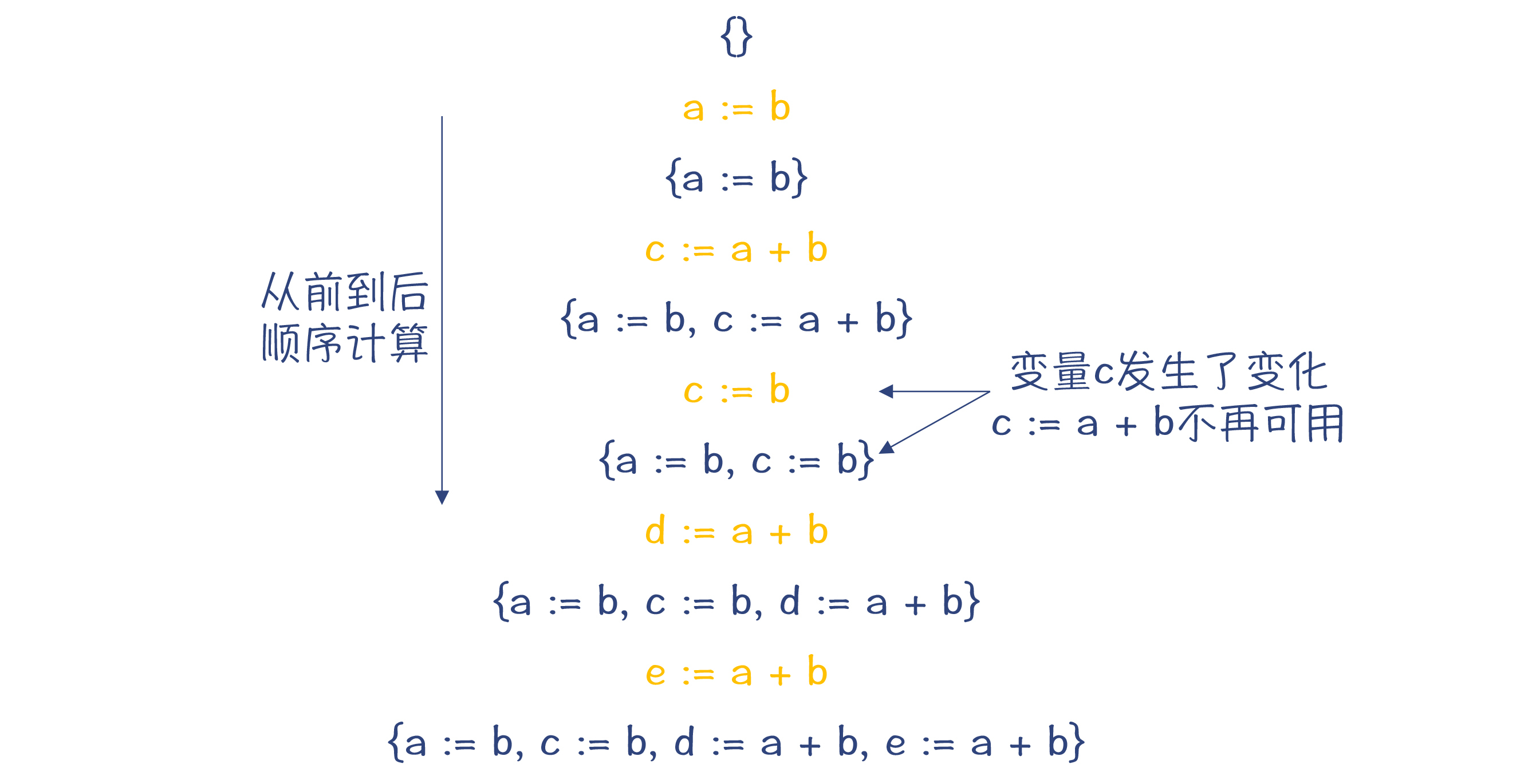 我们知道,基于传统的IR,要做公共子表达式消除,就需要专门做一个“可用表达式”的分析。像下图展示的那样,每扫描一遍代码,就要往一个集合里增加一个可用的表达式。