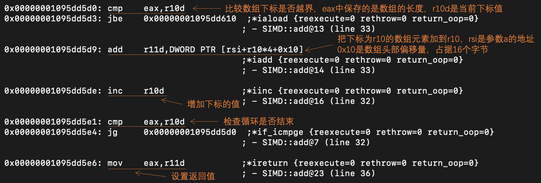 我们还是用Graal做即时编译,并打印出生成的汇编代码。这里我截取了其中的主要部分,给你做了分析: