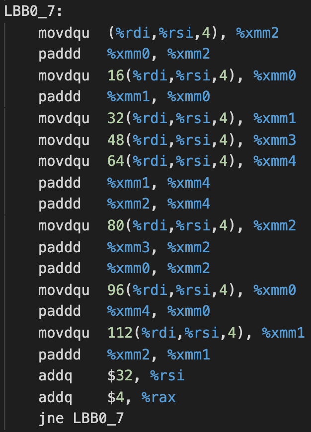 编译生成的汇编代码在SIMD.s中。我截取了其中的骨干部分: