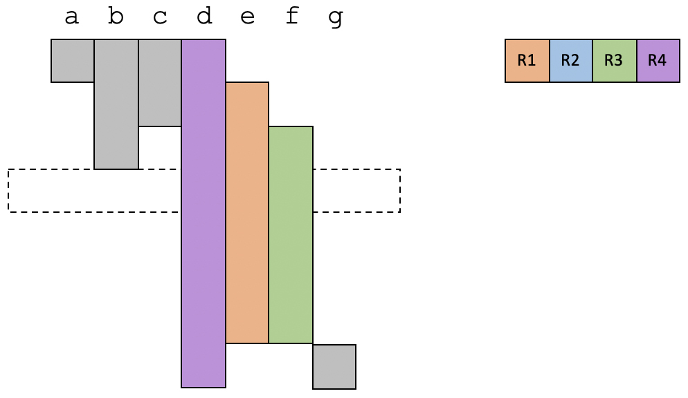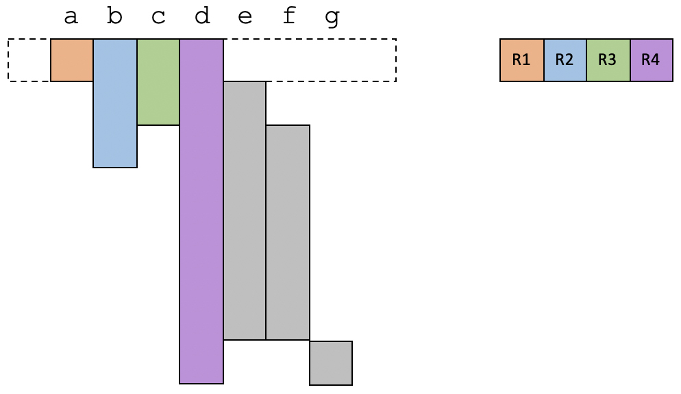 假设我们的程序里有从a到g共7个变量。通过数据流分析中的变量活跃性分析,你其实可以知道每个变量的生存期。现在,我们已知有4个物理寄存器可用,那么我们来看一下要怎么分配这几个物理寄存器。