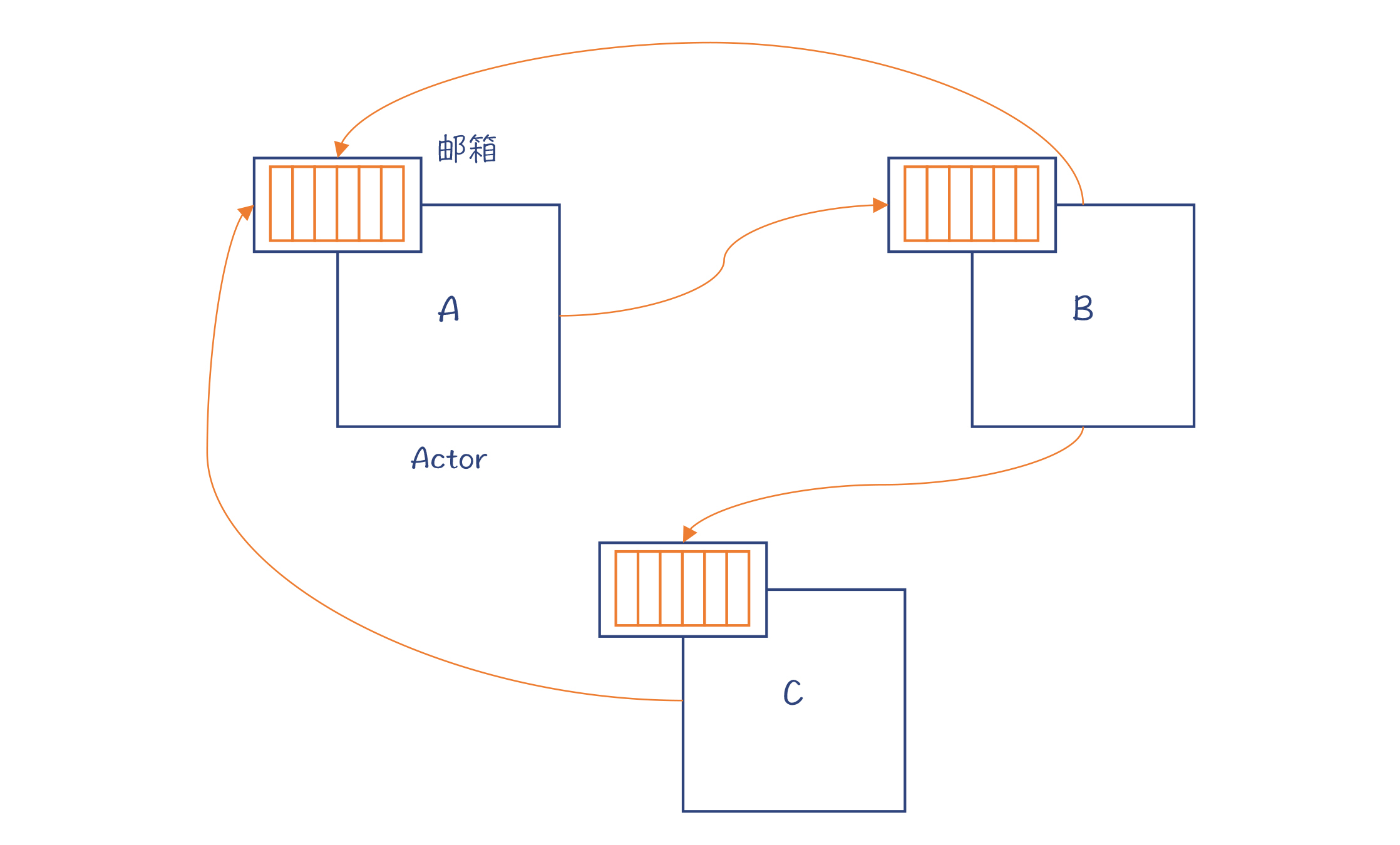 你会注意到,每个Actor都有一个邮箱,用来接收其他Actor发来的消息;每个Actor也都可以给其他Actor发送消息。这就是Actor之间交互的方式。Actor A给Actor B发完消息后就返回,并不会等着Actor B处理完毕,所以它们之间的交互是异步的。如果Actor B要把结果返回给A,也是通过发送消息的方式。
