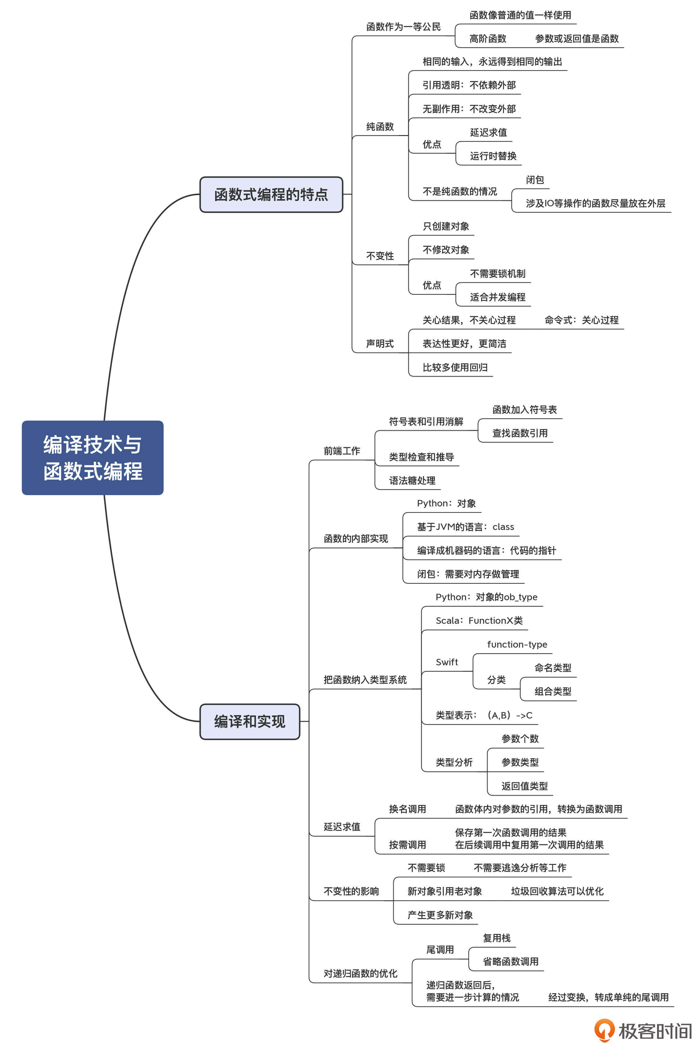 好了,现在我们已经了解了函数式编程的一些关键特征。它的总体思想呢,就是像数学那样去使用函数和值,使可变动部分最小化,让软件的结构变得简单、可预测,从而获得支持并发、更简洁的表达等优势。那么下面,我们就一起来看看如何结合编译原理的相关知识点,来实现函数式编程的这些特征。