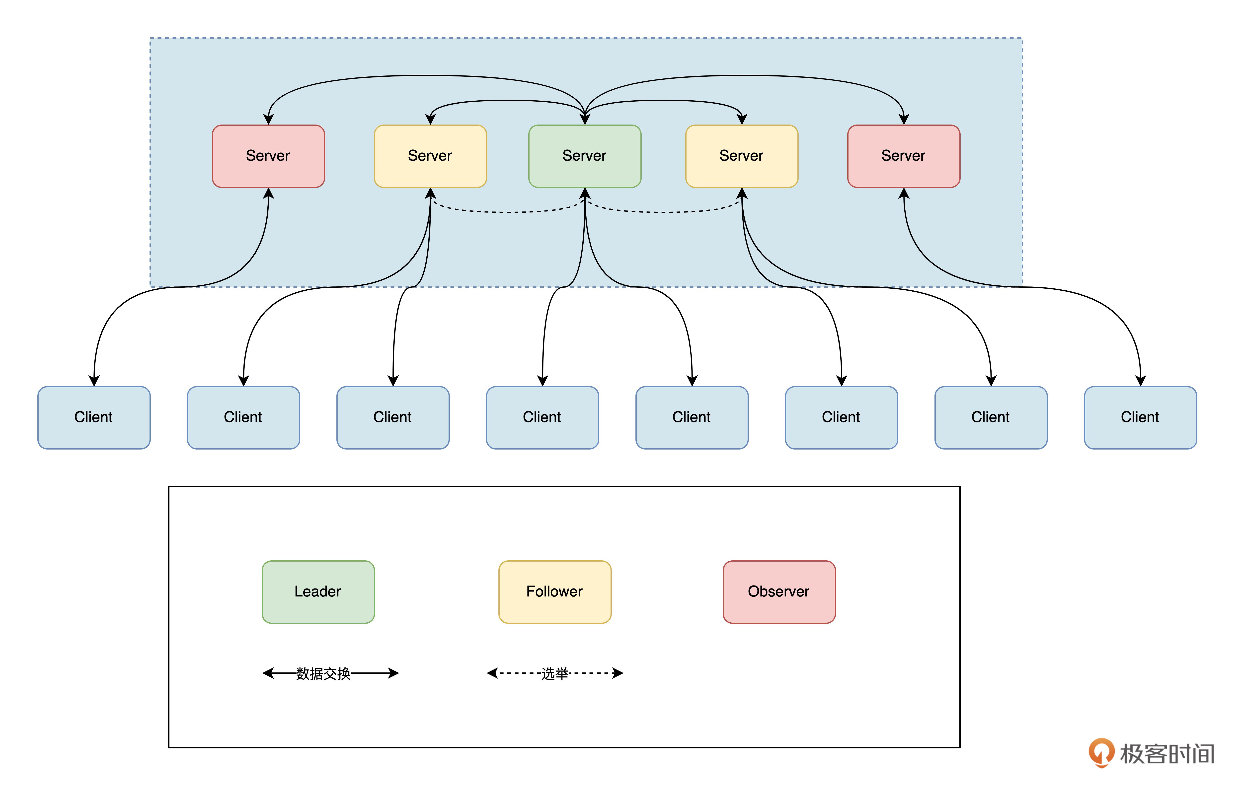 Leader负责进行投票的发起和决议,更新系统状态,Leader是由选举产生的。Follower用于接受客户端请求并向客户端返回结果,在选主过程中会参与投票。